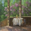 За верандой виднеются цветущие кусты сирени, которые являются настоящим украшением картины. Их пышные лиловые гроздья написаны с такой любовью к деталям, что кажется, будто чувствуешь их аромат. Сирень создаёт яркий живописный фон, контрастирующий с деревянной конструкцией веранды.