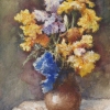Sergey Dorofeev’s still life with a bouquet of irises is a masterful play of color and light, captured in watercolor. The artist skillfully conveys the lushness and intricate curves of the petals, creating an effect of dynamic movement. The bright palette, dominated by golden, blue, and violet shades, seems to come alive, filling the canvas with sunny warmth and depth.