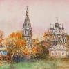 Sergey Dorofeev’s painting «Осенняя глубинка» is a delicate study, imbued with a gentle melancholy and the quiet of provincial life. The traditional Russian landscape comes alive on the canvas: an old church with a tall bell tower is cozily nestled among trees already touched by the golden hues of autumn’s fading.