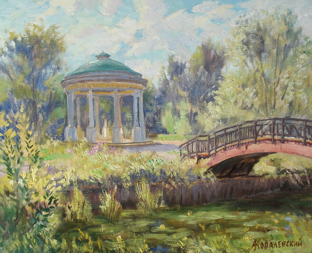 We visited the Sviblovo estate. A small cozy estate in the north of Moscow, it was built next to a small village of the same name, which stood here as early as the mid-15th century. The most interesting place in the park is a small island with a rotunda in the middle. The "Temple of Air" is located on the estate grounds; it is a circular structure covered with a dome supported by columns. The morning side light reveals a Matisse-like color palette in the greenery. An interesting challenge is to paint the white gazebo against the greenery, entirely in shadow. I am sharing the result.