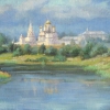 I tried to depict the glow of the monastery buildings in the rays of the sun that appeared from behind the clouds. Powerful clouds are receding, the water surface reflects the light, and there is silence and clarity all around. The view was found from the bridge, allowing one to take in the entire perspective of the landscape and the monastery.