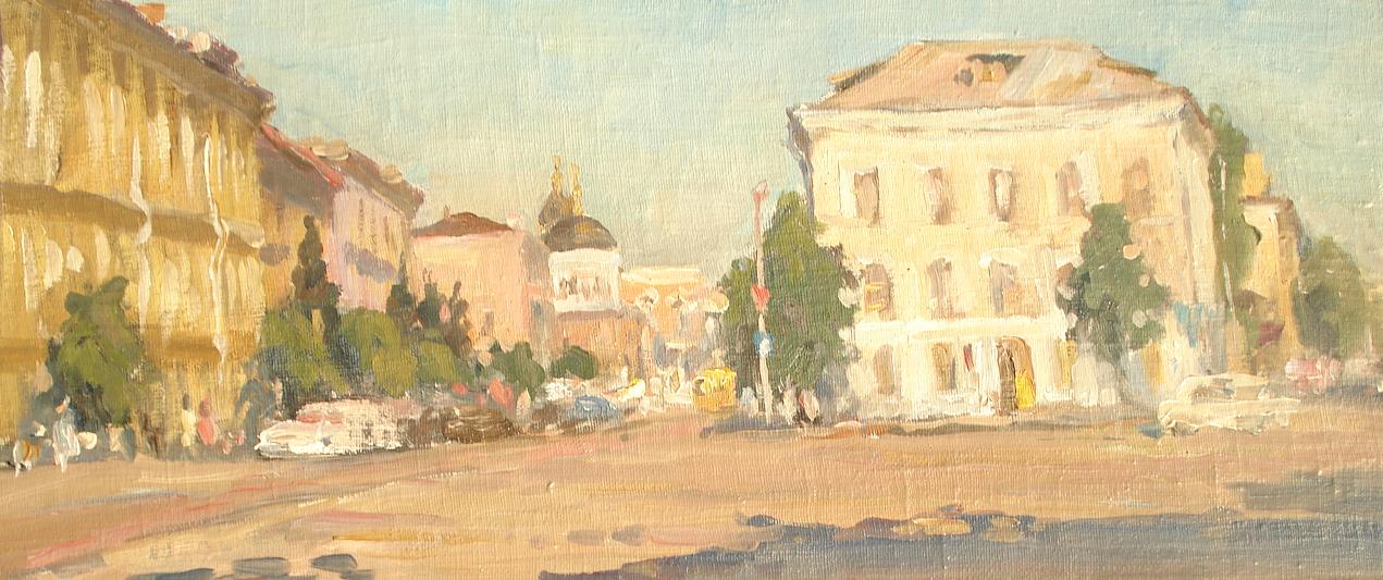 Вдали, в центре, просматривается купол православного храма, написанный более обобщенно, но играющий важную роль в определении духа места. Его светлая округлая форма контрастирует с прямоугольными формами гражданских зданий.