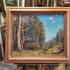 Лес вокруг — главное действующее лицо пейзажа. Художник изображает деревья с разной степенью детализации. На переднем плане — берёза с белым стволом и светлой, едва распустившейся листвой. Далее видны более тёмные хвойные деревья, создающие глубину и контраст. В цветовой палитре леса чувствуется осень или ранняя весна: здесь присутствуют и зелёные, и охристые, и бурые оттенки.