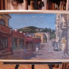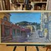 Andrey Kovalevsky uses a warm, rich palette dominated by ochre, terracotta, and deep green tones, contrasting with the blue of the sky and shadows. The painting «Karl Marx Street in Kislovodsk» is a sunny, positive image capturing a moment of summer rest and tranquility in one of the most picturesque towns of the Caucasian Mineral Waters region.