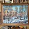 The painting by Andrey Kovalevsky «Moscow City Duma» is a classic example of an urban landscape, where the grandeur of historic architecture blends with the lively atmosphere of a frosty day. The artist captured the Duma building surrounded by a park area bathed in bright winter sunlight.