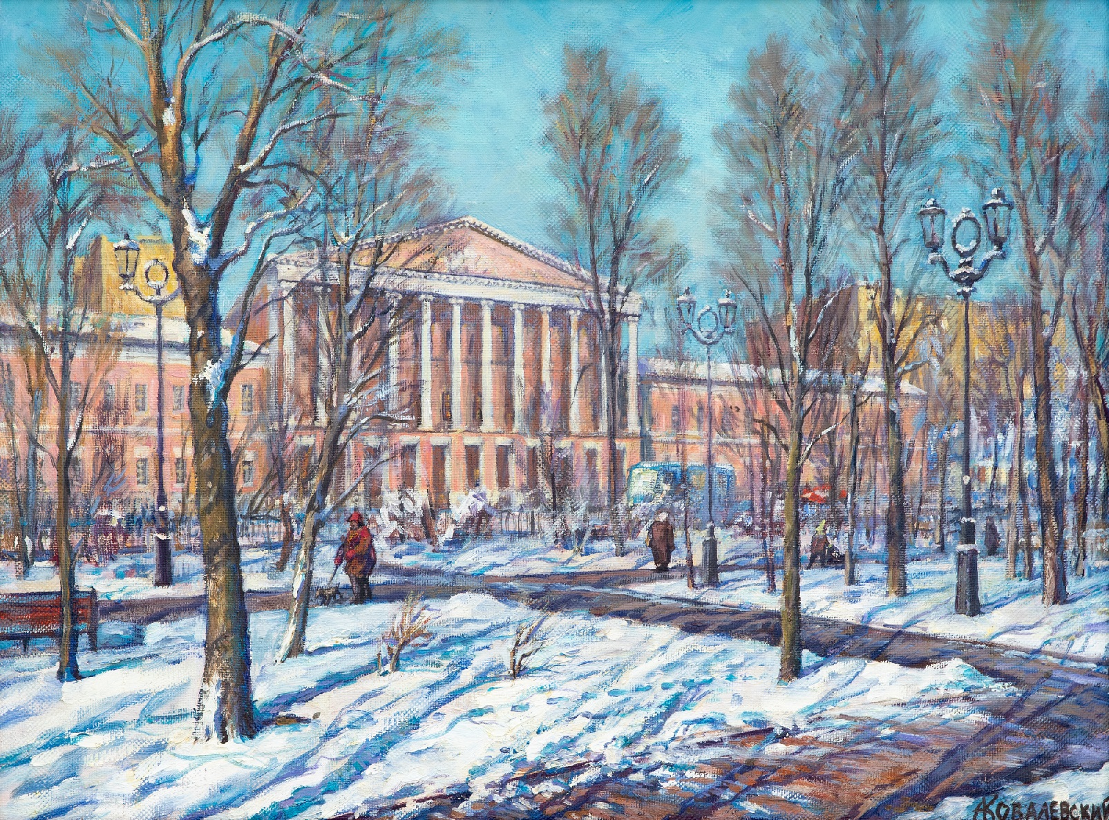 The central subject is the monumental facade of the building with majestic columns and a classical pediment. Despite the winter scene, Kovalevsky avoids excessive harshness: the building’s walls have a warm pinkish-beige tone that beautifully contrasts with the cold blue shadows on the snow.
