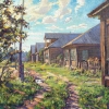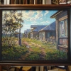 The central axis of the composition, as in «Morning», is a dirt village road stretching into the distance between rows of old log houses. However, in the evening, the shadows grow longer and denser. On the road surface, where traces of daytime moisture are still visible, long blue-purple shadows from houses and trees appear, creating a deep, contrasting pattern.