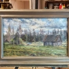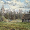 In the center of the composition on the right stands an old log bathhouse. Its roof, painted in dark, earthy tones, contrasts with the overall light palette of the canvas. The structure looks solid but abandoned, adding a note of quiet melancholy to the scene.