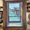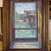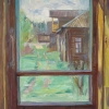 Through the glass, there is a view of the yard painted in bright summer tones. Lush, fresh greenery dominates, rendered with loose, confident brushstrokes. On the right, there is another wooden structure—possibly part of a neighboring house or a shed—with a dark roof and a small window.