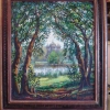 The landscape is constructed like a «window» or portal, framed by two sturdy dark-trunked trees in the foreground. Their trunks, painted in warm brown and reddish tones, form a natural arch through which the viewer looks deep into the park. The dense foliage of these trees is rendered with confident, textured strokes of rich green color.