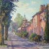 Andrey Kovalevsky's painting «Oktyabrskaya Street in Svetlogorsk» is a sunny and welcoming urban landscape that conveys the atmosphere of a resort town on the Baltic Sea coast, likely in the height of summer. The artist masterfully captures the play of light and shadow on the architecture and foliage.
