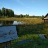 The landscape around the pond is a field or meadow covered with tall grass. The greenery is layered: both bright, fresh shades of young grass and more muted, yellowish-brown tones hinting at the approaching autumn are visible.