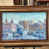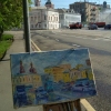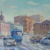 Working on this piece was very unexpected for me. I started still under raindrops, continued under a clear sky. And in subsequent sessions, I finished it in dry weather. But the wetness of the asphalt, umbrellas, and puddles bring freshness and life (I tried to preserve it). The work has three layers: the first rainy one with wet urban hustle, the second as a backdrop in a theater, a wet, drying pink-beige-lilac city, and the third - the backdrop - a shining sky. Life is a theater...