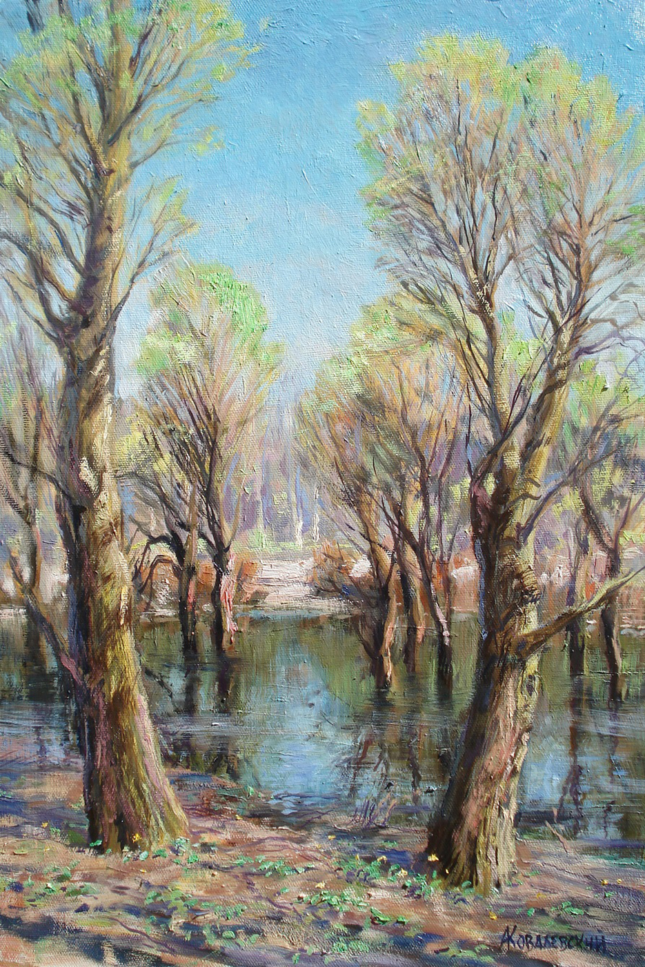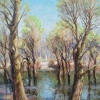 Spring in Izmailovsky Park, capturing the moisture and oiliness of the water, the brightest kokoshniks of young leaves on the willows, the play of light in the branches and on the ground. And above it all – the magnificent dome of azure skies. I tried to convey the freshness and beauty of spring, the brightness of color highlights, and the wetness of the pond's surface between the trunks.