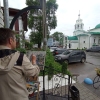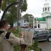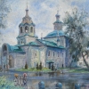 In Vologda, my wife and I were staying in a hotel near the church. The rains started pouring. From the café porch, I was painting a shiny drizzle, trying to capture the light and reflections on the church building, the reflections on the asphalt, and the slanting drizzle in the sky.