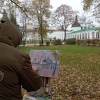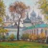 We traveled as a family to Rostov Veliky. The autumn view of the Kremlin through the trees was enchanting. Old, mighty trees in their autumn attire, and through their unique fairy-tale headdress of foliage, the walls and towers are visible – ancient, emerald-silver. The sky is pink-pearl, and the autumn weather is fresh. These wonderful effects and colors were what he tried to convey in his work.