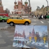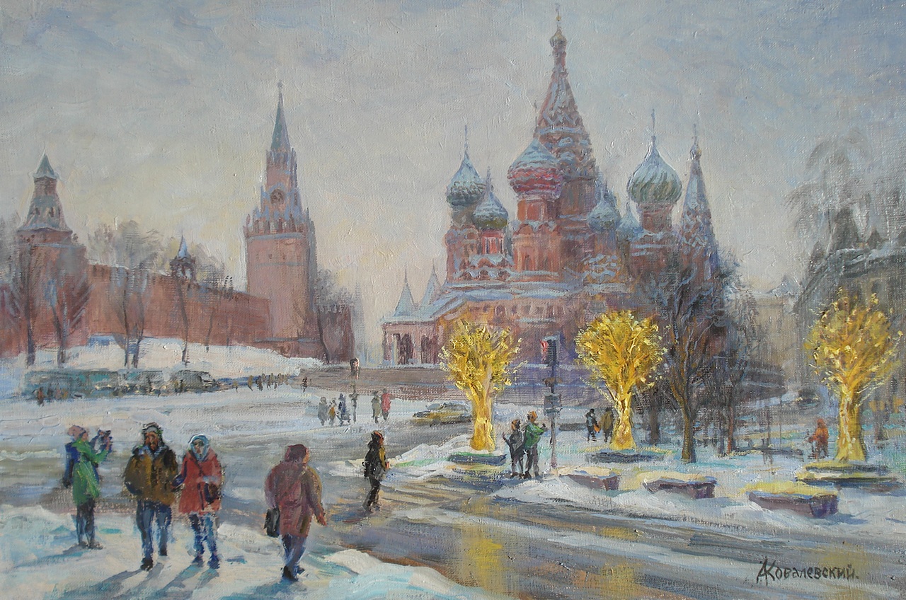 A magical winter view of St. Basil's Cathedral and the Kremlin. The lighting is wonderful, especially its contrast with the abundant snowdrifts. I tried to convey the gentle winter light of the faintly breaking sun, its reflections on the snow-covered cathedral. A unified pearly color palette of our winter.