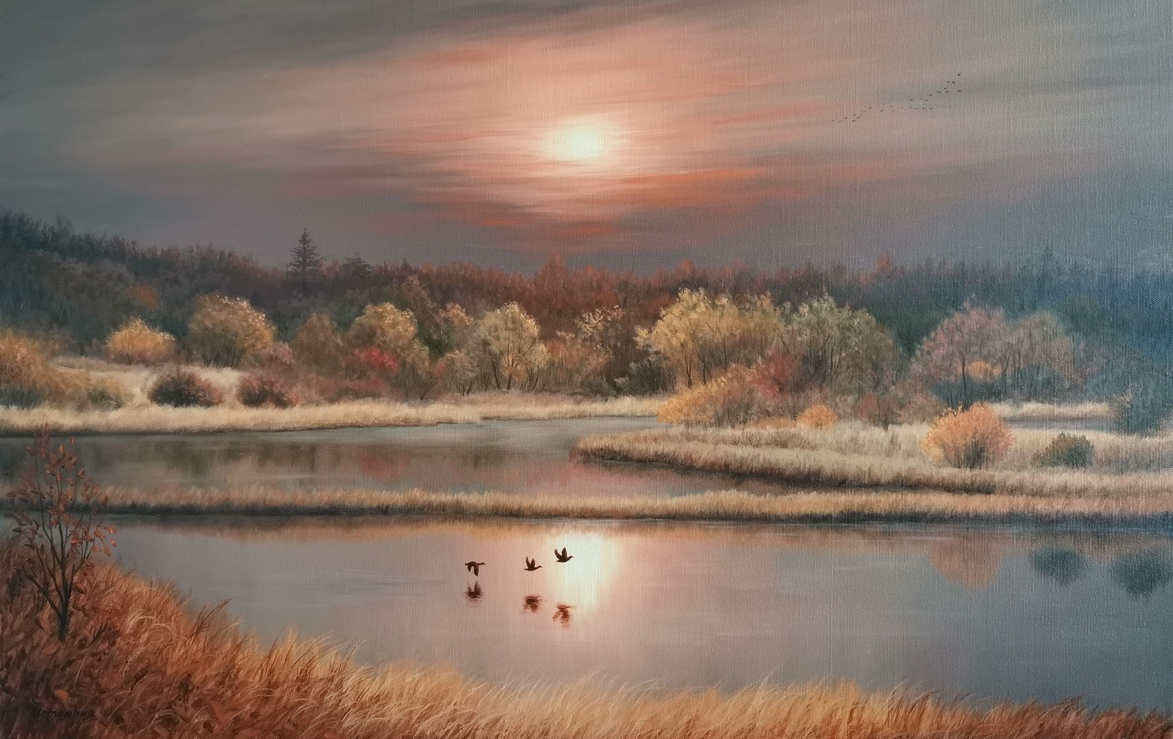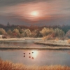This work is a true symphony of color. The rich palette of autumn foliage is reflected in the water, mixing with the golden reflections of the sunset. The small brushstrokes of which the trees and bushes are painted create a shimmering effect, and the ducks on the water add intimacy. The artist masterfully conveyed the play of light, where cold shadows coexist with warm areas illuminated by the last rays of the sun.