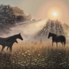Dawn finds a herd of horses in a dew-covered meadow. The first rays of the sun break through the morning fog, enveloping the scene in a golden glow. The artist subtly conveys the texture – the shiny croup of the animals, the fluffy manes, the damp grass. The composition of the work is built on diagonals: the silhouettes of the trees on the right are balanced by a group of horses on the left. The silvery shades of the morning sky gradually give way to pinkish ones, creating a sense of the awakening day.