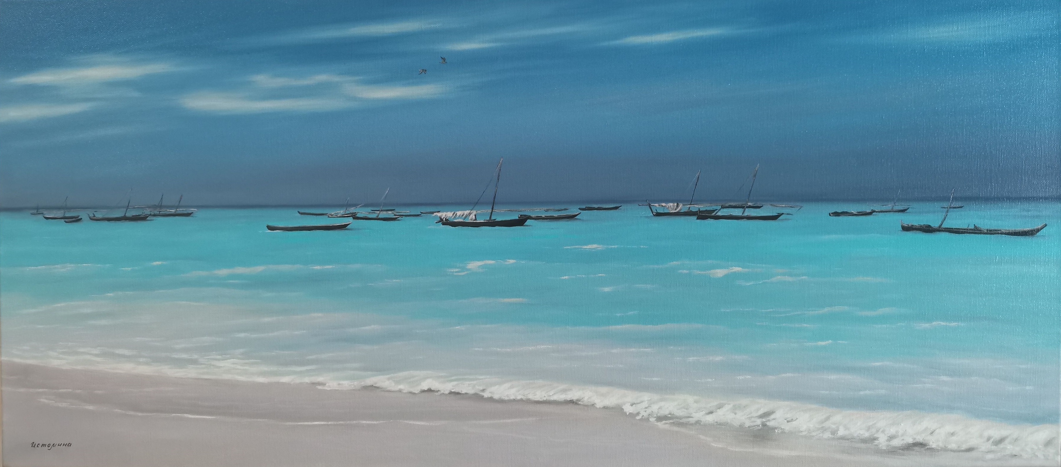 A tropical beach with water shimmering in all shades of turquoise. Fishing boats painted in bright colors sway on barely noticeable waves. The sand, painted with impasto brushstrokes with the addition of shell rock, seems warm underfoot. The sky is especially well rendered – light cirrus clouds create a feeling of endless space. This work is a visual vacation, where every element breathes carefreeness and peace.