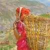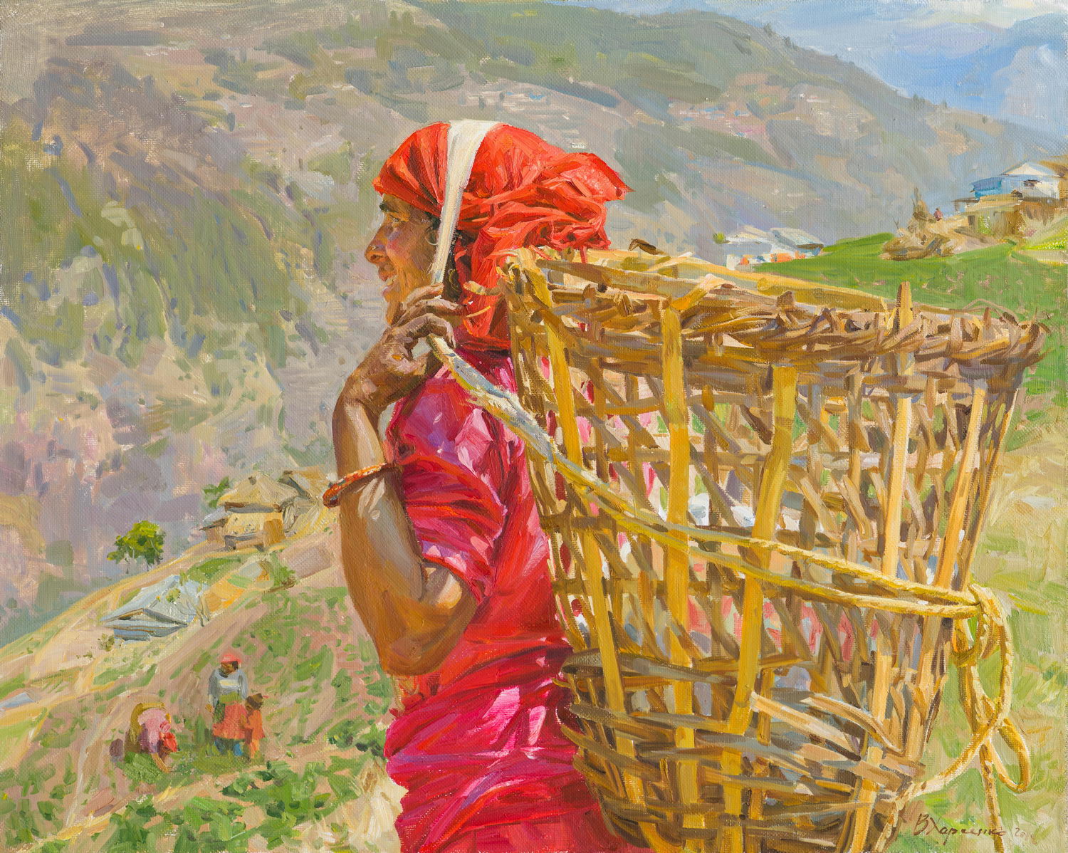 Victoria Kharchenko's painting "Noon" is a bright, sunny, and realistic landscape that conveys the atmosphere of a scorching midday in a mountainous area, likely in one of the Asian countries. The main motif of the artwork is the image of a hardworking woman carrying a large woven basket on her back. The figure of the woman is centrally positioned in the composition. She is depicted in profile, her face turned towards the horizon.