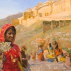 In front of the fort, in the foreground, a scene from everyday life unfolds. We see an Indian woman in a bright red sari, offering souvenirs to tourists. Her face and hands are tanned by the sun, her gaze is expressive and full of dignity. She is part of this landscape, an integral element of the Indian flavor.