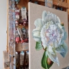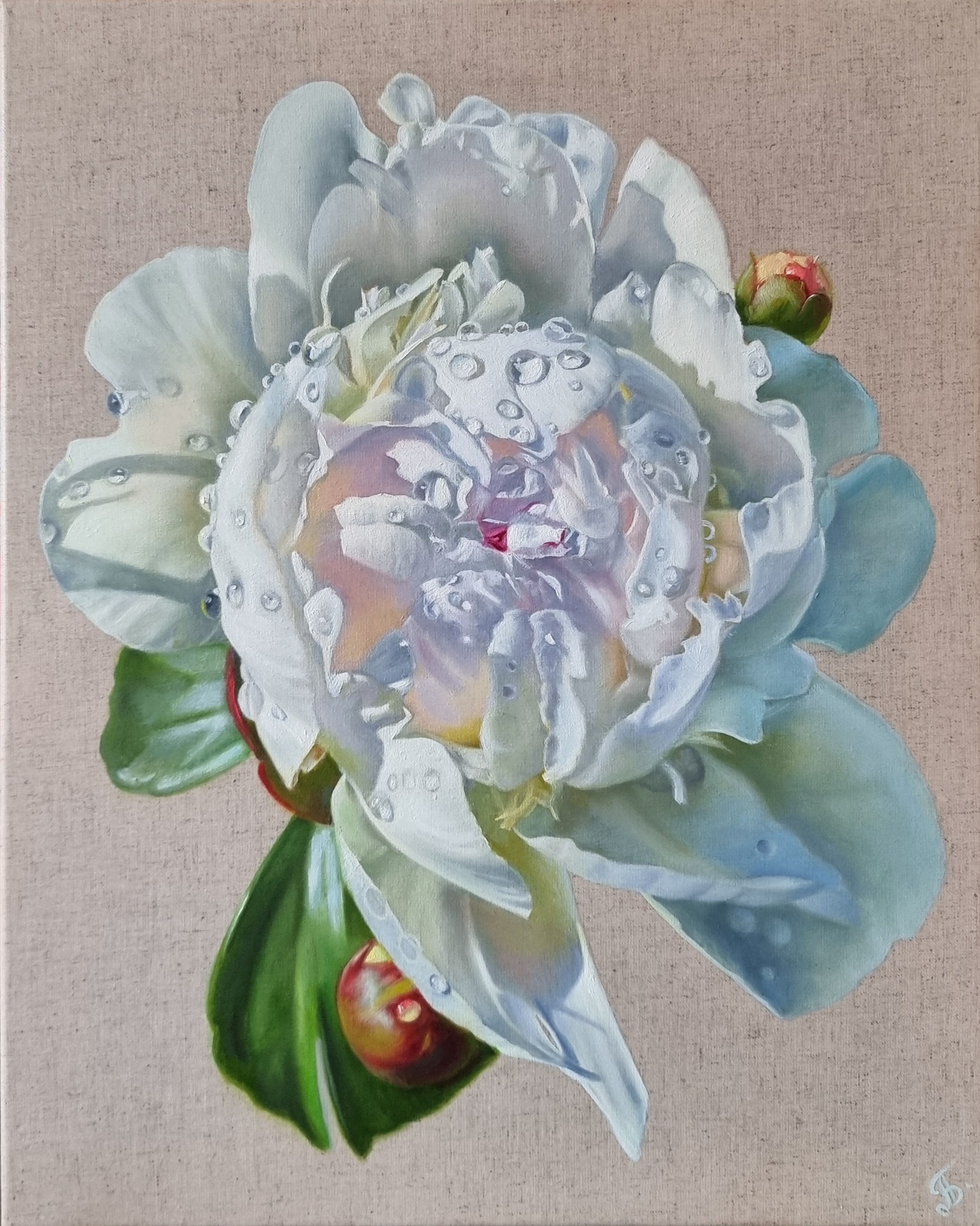 This painting is dedicated once again to my beloved peonies. And it’s another painting using a transparent ground. I love natural fabrics. And I always feel sorry to cover natural, living linen with primer. But to preserve the vibrancy and naturalness of the linen, you have to work hard. After all, for high-quality oil painting, preparing such a base is much more complex, starting from finding a very high-quality canvas and ending with layers of sizing and uniform coating of the canvas with a transparent ground. But for me, “the game is worth the candle.”
