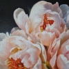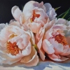 Three lush peonies of a rich pink color glow like gems against a dark background. Their petals, sometimes translucent at the edges, sometimes dense at the core, surround golden stamens, reminiscent of tiny stars. The deep background (brown with a shade of grape) enhances the radiance of the flowers, creating the effect of a precious stone in a frame. The composition breathes romance and mystery - as if these flowers had just been picked in a moonlit garden and frozen in their perfection forever.