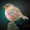 The painting depicts a small bird, sitting on a branch or piece of wood. The bird is turned to the left, its soft plumage is made in delicate shades of pink, gray, bluish and yellow. The artist has drawn each feather in detail, which gives the image realism and trepidation. The background is made in a rich dark green color, which emphasizes the figure of the bird and creates a feeling of comfort and peace. The painting conveys an atmosphere of silence of nature and innocence, reminding us of the beauty of everyday moments and the fragility of the living world.
