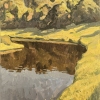 In the background, green hills and trees rise, giving the painting volume and an atmosphere of natural serenity. The play of light and shadow on the surface adds realism and dynamics to the landscape. Brushstrokes convey the liveliness of nature, and the muted color palette creates an atmosphere of peace.