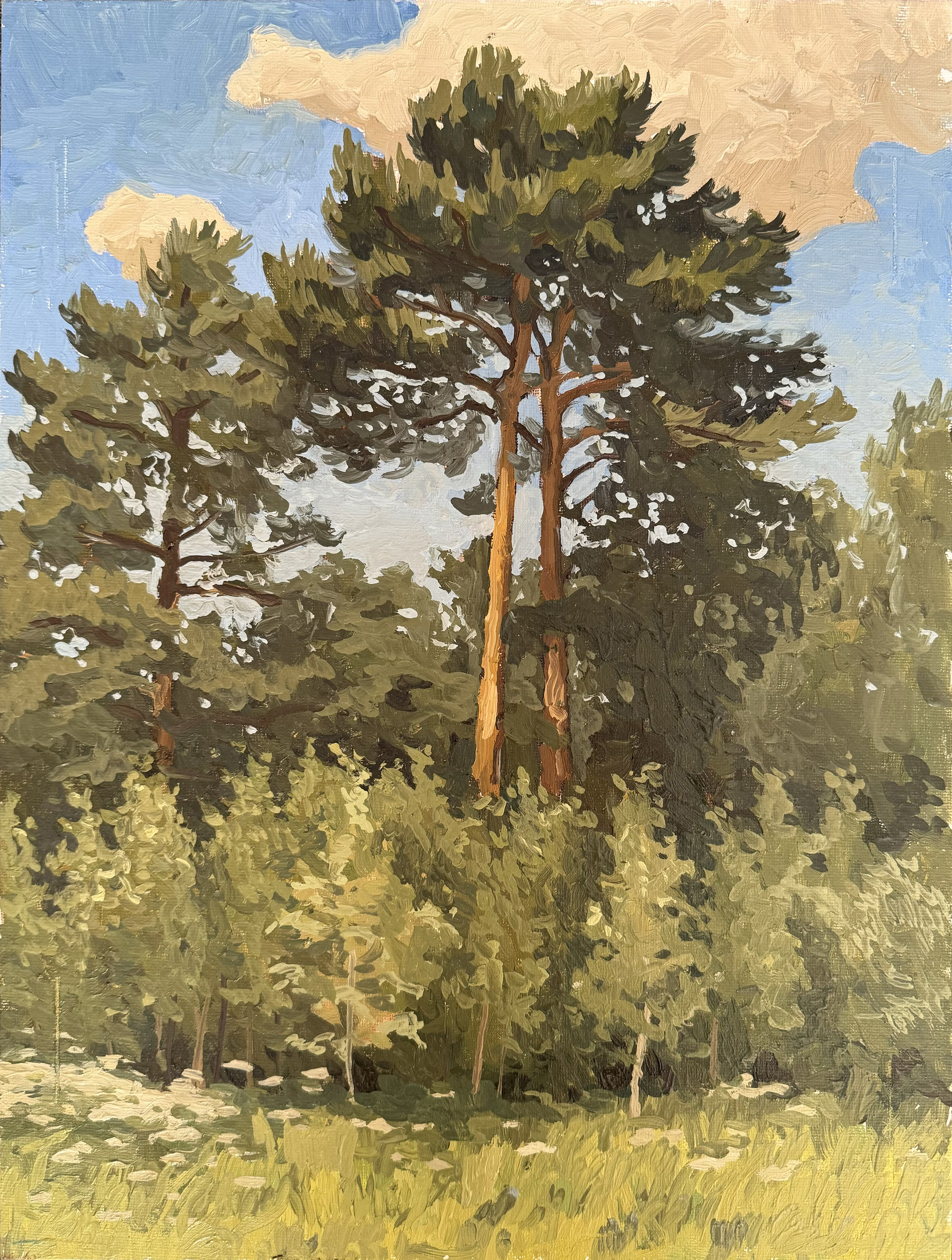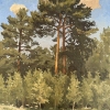 Before us is a picturesque painting, capturing a corner of nature on a summer day. In the center of the composition, powerful pines with spreading crowns rise majestically, their trunks of a warm ochre shade stand out against the background of dense greenery. At the foot of the trees, a young grove spreads out, full of low-growing bushes and delicate grasses.