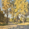 This oil painting creates a warm atmosphere of an autumn day. In the foreground, a path is visible, illuminated by the sun's rays breaking through the crown of tall trees, and playing with light and shadow. The foliage is saturated with golden-yellow shades, which symbolizes the beginning of autumn.