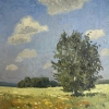 This is an impressionist painting of a summer landscape with a lone birch tree standing in the center of a vast field. The lush crown of the tree is saturated with many green shades, which gives the image liveliness and naturalness.