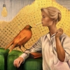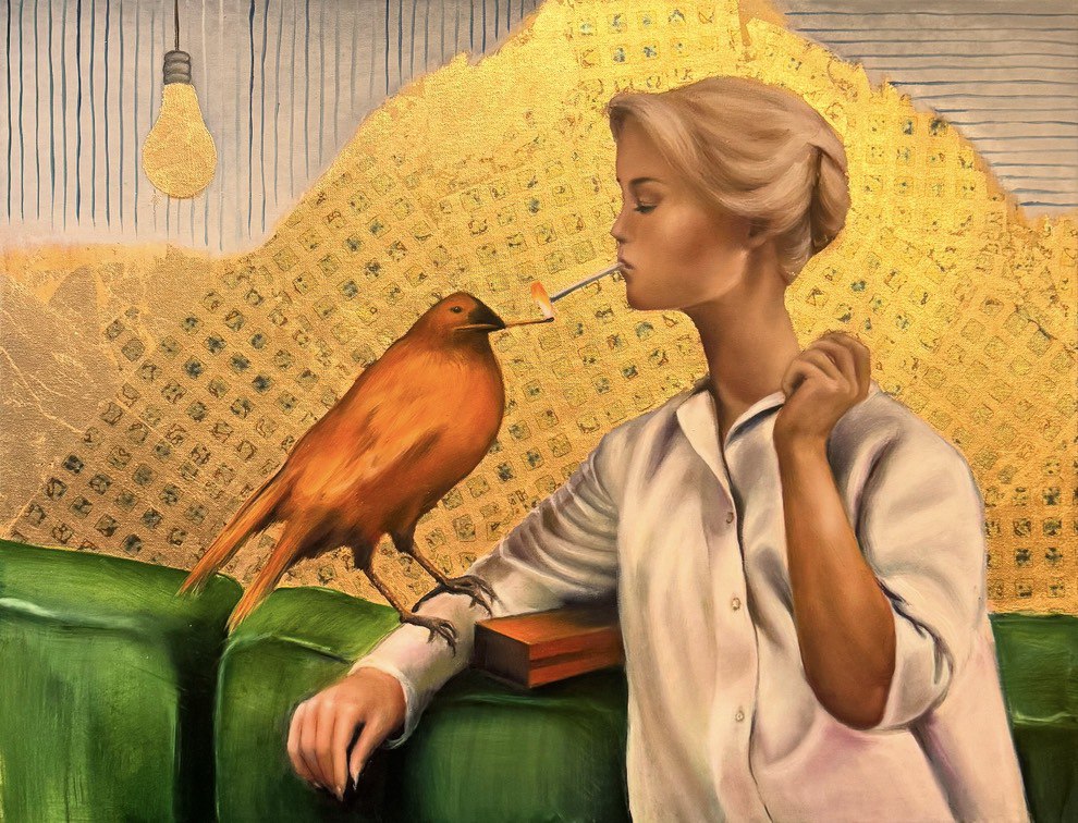 The painting depicts a young woman in a white shirt sitting on a green sofa. Next to her, on the back of the sofa, there is a large red bird. The woman and the bird are looking at each other, and between their beak and lips there is a cigarette clamped - it seems as if they are smoking together. The background of the painting is made in gold and gray shades with an abstract pattern, where a painted light bulb is noticeable. The atmosphere of the canvas is simultaneously surreal and ironic. The painting evokes associations with dreaminess, the unusualness of everyday life and a slight mockery of familiar suddenly inverted plots.