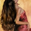 The painting depicts a woman with long, thick chestnut hair that flows down her back. She is dressed in a tight dress of a rich burgundy color, emphasizing her slender figure. The woman has slightly thrown her head back, closed her eyes and seems to enjoy the feeling of complete freedom and peace. Her pose radiates sensuality and inner harmony. The warm golden background of the painting emphasizes the softness and sophistication of the image, creating an atmosphere of coziness and light dreaminess. The painting amazes with its realism and attention to detail, creating a feeling in the viewer that the heroine is about to come to life.