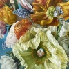 The painting depicts a bright and cheerful bouquet of spring flowers, executed in the style of hyperrealism. Against the background of the sky-blue sky, lush poppies, anemones and buttercups bloom, striking with their plasticity of forms, rich shades of yellow, orange, white and green. Particular attention is drawn to a large, soft green flower in the foreground: in its center is hidden a miniature scene - a girl in a traditional dress against the background of a field. This unusual element adds a fairy tale and depth to the painting, creating the illusion of a hidden world inside the flower. The work combines the beauty of nature and the motif of mystery, inviting the viewer to thoughtfully examine the details and immerse themselves in the atmosphere of spring inspiration.