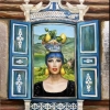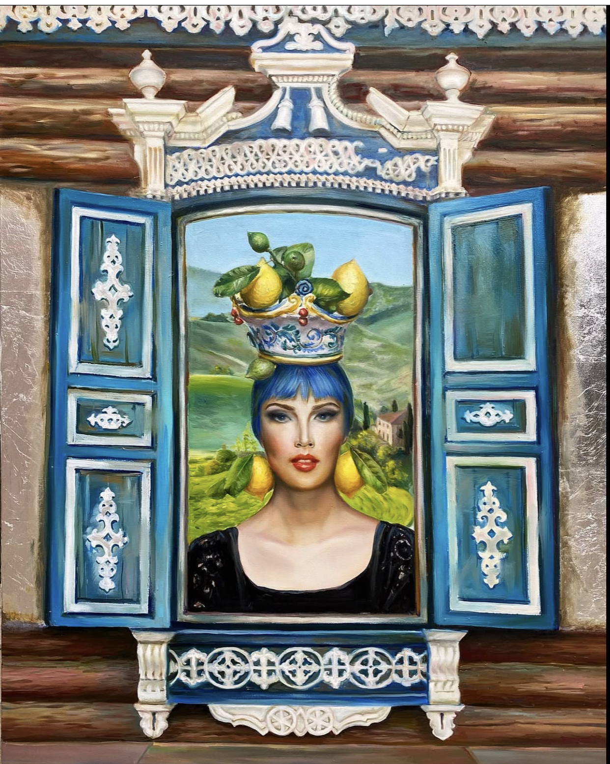 The woman is depicted in the opening of a blue carved window, decorated with rich wooden woven carvings, typical of Russian architecture. A picturesque landscape opens up outside the window: green hills, an old house and a blue sky create a sense of depth and peace.