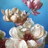 The painting depicts large flowers in the style of realism, painted with amazing detail against the background of a bright blue sky. The buds are located in different planes, filling most of the canvas. The foreground is occupied by a lush white flower with a soft pink hue, opening its petals towards the viewer. The background is decorated with darker and pinker buds, creating a feeling of freshness and lightness. The artist masterfully conveyed the play of light on the velvety petals and their velvety texture. The composition is filled with harmony and peace, and the combination of delicate flowers and a bright sky emphasizes the beauty of nature and the fleetingness of its moments.