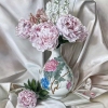 The painting depicts an exquisite still life with a bouquet of peonies and other garden flowers, neatly standing in a porcelain vase with a painted ornament. Delicate shades of pink, white and barely perceptible blue create an atmosphere of lightness and tranquility. The background is made in the form of flowing satin fabric of pearl color, which gives the whole composition a special sophistication and emphasizes the elegance of the flowers. In the foreground of the basket lies one peony, complementing the harmony of the space. The painting is filled with light, purity and a romantic mood, as if inviting the viewer to linger in this quiet corner of beauty and comfort.