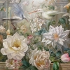 This painting depicts an exquisite floral composition filled with an atmosphere of spring freshness and romance. In the center of the canvas, large white and soft pink flowers have blossomed - peonies and roses, the petals of which look airy and realistic. Among the luxurious floristry, two graceful birds with thin curved beaks stand out. Light, pastel colors, soft light and a barely noticeable architectural detail in the background give the painting a fairy-tale-idealistic mood. The canvas is filled with the harmony of nature, silence and magic of awakening life.
