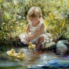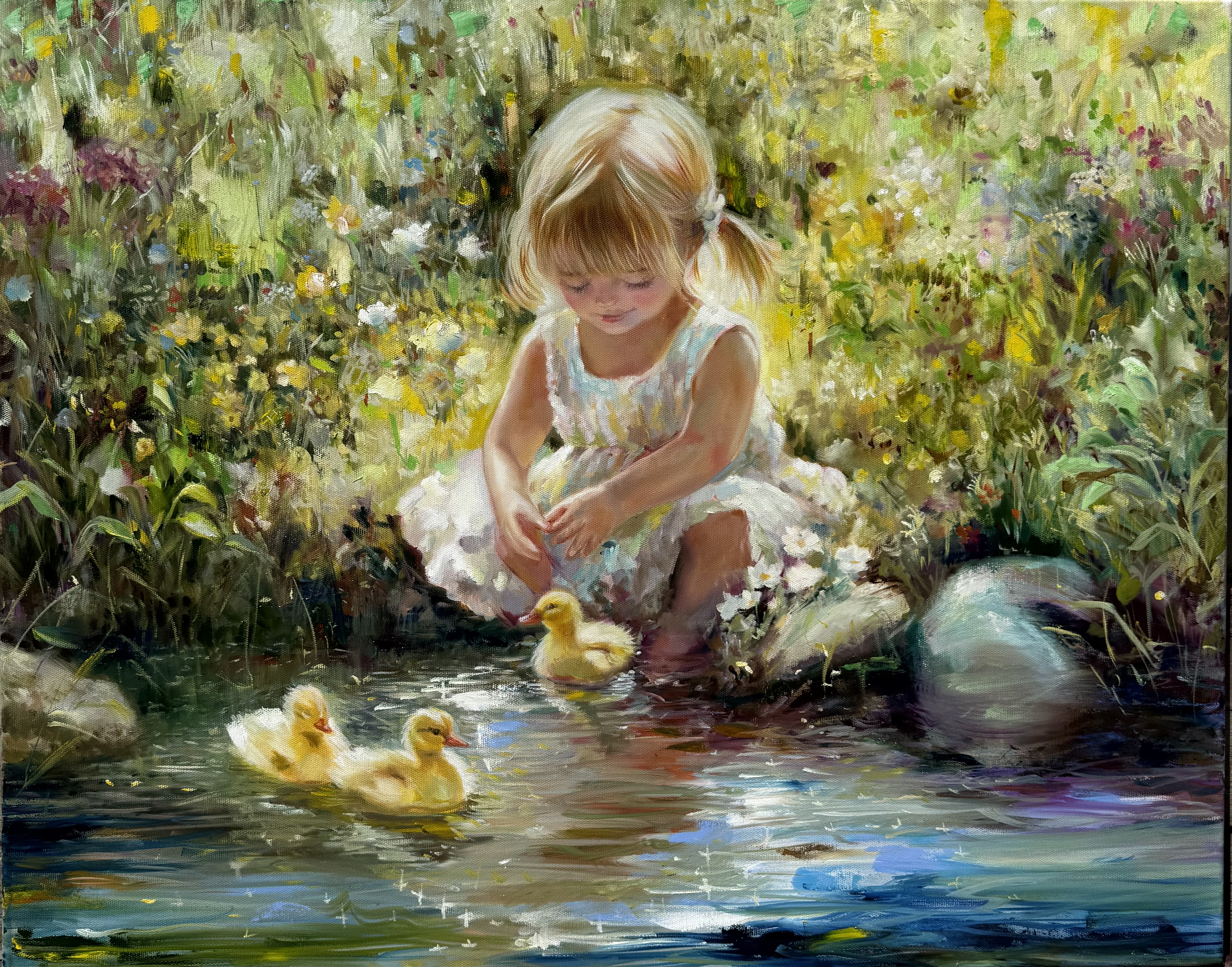 В центре картины — маленькая девочка со светлыми волосами, собранными в хвостики, которая сидит на корточках у самого края воды. Она одета в лёгкое белое или кремовое платье, которое кажется воздушным и слегка прозрачным. Её голова опущена, взгляд устремлён на воду, в которой она, вероятно, играет или кормит маленьких утят. Поза и выражение лица девочки передают полную поглощённость моментом и спокойную сосредоточенность.