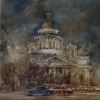 The painting depicts a winter evening in the city, in front of a majestic cathedral, reminiscent of St. Isaac's Cathedral in St. Petersburg. The huge dome, colonnades and architectural details of the temple are executed in muted, warm shades - this enhances the atmosphere of coziness and tranquility. Two vintage cars are parked in front of the cathedral, which gives the scene a special retro mood and refers the viewer to the Soviet era. The trees without leaves, covered with frost, emphasize the winter season, and the soft diffused light of the lanterns adds notes of romance and light nostalgia to the composition. The painting immerses the viewer in an atmosphere of tranquility and grandeur of a northern city in winter.