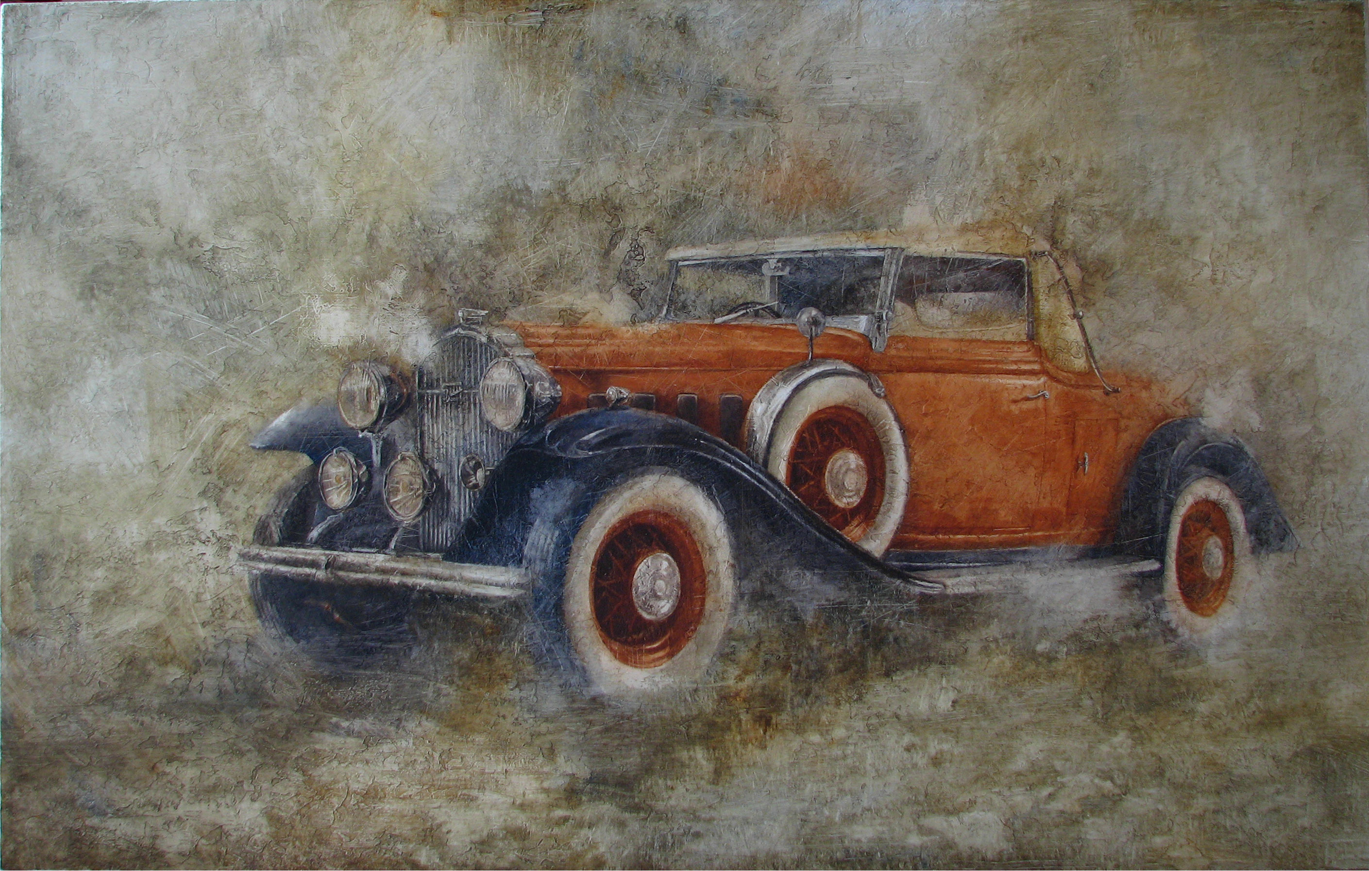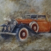 The painting depicts a vintage car, made in a technique reminiscent of an old photograph or a watercolor canvas. A powerful car of classic 1930s design - with massive headlights, rounded wings and a spectacular radiator grille - stands against a blurred background, as if surrounded by a light fog or dust of time. The bright orange color of the body and contrasting dark details emphasize the individuality of the car, returning the viewer to the era of luxury and elegance. The artist strives to convey not only the technical perfection of the retro car, but also the atmosphere of past years, evoking nostalgic motifs and a sense of timeless style.