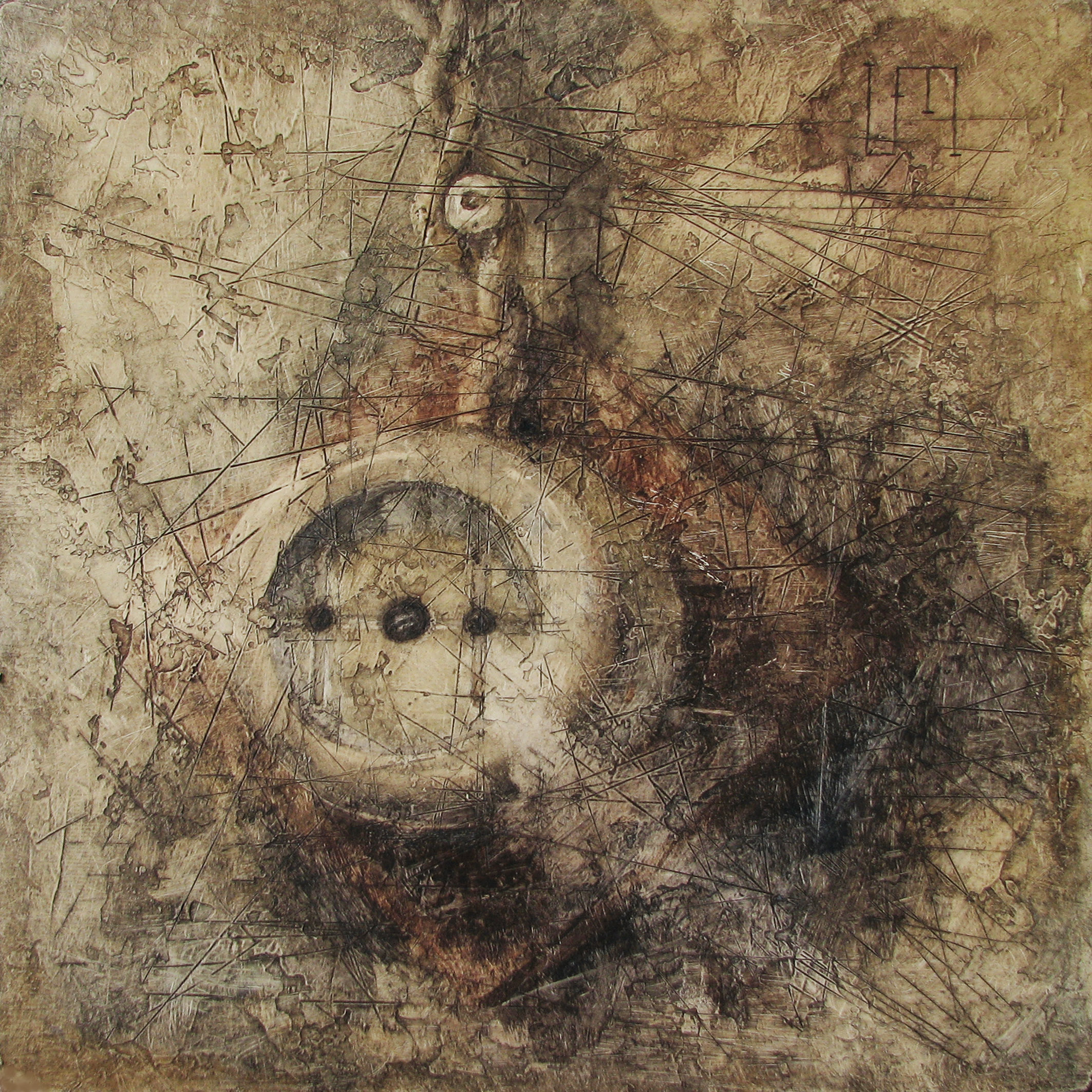 This is an abstract painting done in earthy and brown tones, with a dominant texture and numerous chaotic lines crossing the surface of the canvas. In the center of the composition, a rounded shape is visible, reminiscent of a mechanical object or a stylized face with three dots creating the illusion of eyes and a mouth, as well as a dark arc at the top, similar to an eyebrow. Above the circle, there is a small protruding element reminiscent of an eye, which seems to be attentively watching the viewer. The whole work is filled with a sense of time, aging and traces left on the surface - as if before us is a fragment of an old wall or an artifact carrying a history and a mystery. The painting evokes associations with industrial motifs, as well as with the process of destruction and restoration, awakening the imagination to search for meaning in abstraction.