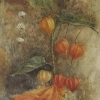 This is an exquisite still life painting done in warm, muted tones. In the center of the composition is a transparent glass vase containing physalis branches decorated with bright orange lanterns-fruits. Their fragile veins and rich colors contrast beautifully with the soft background and muted green leaves. In the foreground lies an autumn maple leaf, as if it had just fallen, emphasizing the atmosphere of the passing autumn. The calm, matte background of the painting is reminiscent of old plaster, creating the effect of light antiquity and nostalgia. The painting is permeated with warm light, creating a feeling of coziness and silence, inviting the viewer to reflection and warm memories of golden autumn days.