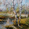 The painting depicts a spring landscape of Russian nature. In the center of the composition flows a small quiet river, the water of which reflects the blue sky and surrounding trees. Along the banks grow slender birches with white trunks and barely blossomed buds, creating a feeling of lightness and coolness. In the background, thick green spruce trees are visible, bringing freshness and depth to the landscape. The warm spring sun illuminates the grass and the first islands of greenery, in places still covered with the remains of snow. The painting is filled with peace, harmony and the awakening of nature after a long winter.