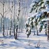The painting depicts a winter forest. In the foreground is a fluffy spruce tree, the branches of which are covered with a thick layer of fresh snow. Slender birches with white trunks grow next to the spruce. Soft, clean snow lies everywhere, sparkling in the sun with blue and pink shadows. Light traces left by animals or birds are visible on the snow. In the depths of the forest, the silhouettes of other trees can be discerned, and a cold bluish light breaks through between them. The painting is filled with silence, tranquility and a sense of the purity of nature in winter.