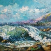 This is an oil painting on canvas, done in the impressionist technique. The canvas depicts a seascape: a wave crashes against a rocky shore, the water sparkles with many shades of blue, green and white. The painting conveys a feeling of freshness of the sea breeze and the dynamics of the water movement. Light sailboats are visible on the horizon, and in the background rise mountains painted in lilac and green tones. A bright sky with fluffy clouds emphasizes the atmosphere of lightness and freedom that fills this seascape.
