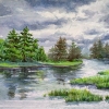 The painting depicts a picturesque corner of nature - a river landscape in rainy weather. In the foreground, thickets of fresh green grass and reflection in calm water are visible. Slender pines and birches grow along the bank, their crowns are reflected on the surface of the river. In the distance, a dense forest can be guessed, shrouded in a light haze. Storm clouds have covered the sky, which makes the light seem soft and muted. Through the silvery rain, drops falling on the water and light ripples on the river are visible. The painting conveys an atmosphere of peace, freshness and slight sadness, characteristic of a rainy summer day.