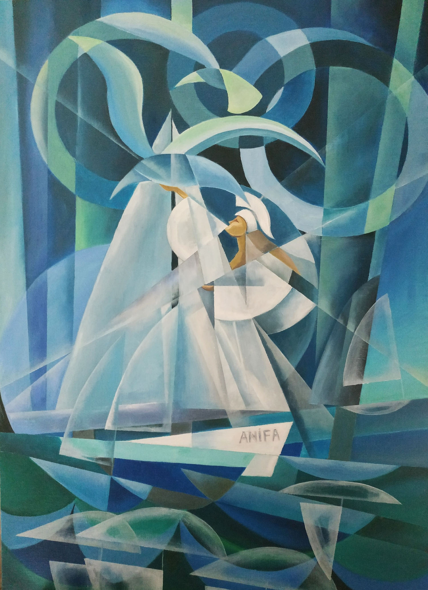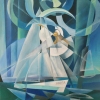 The painting depicts an abstract composition in the style of cubism, executed mainly in a cold range with a predominance of blue, light blue and green shades. The central element of the work is a boat with white sails, partially abstracted and broken into many geometric shapes. It shows the silhouette of a person dressed in light clothes, which gives the painting dynamism and a sense of movement. In the upper part of the canvas, swirling lines and circles create a sense of waves or wind, enhancing the marine atmosphere of the work. The work evokes associations with the sea and travel, and the abstract manner of execution adds mystery to it and allows the viewer to imagine the plot of what is happening.